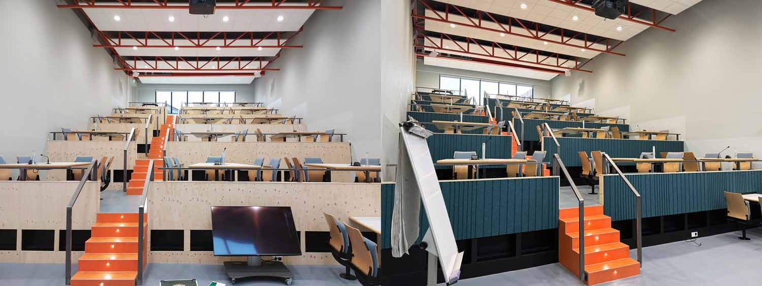 In gebouw PPLE van de Universiteit van Amsterdam realiseerden wij een reeks akoestische oplossingen: in een grote collegezaal, diverse spreekruimtes en de achterwand van de informatiebalie brachten we volledig door ons vervaardigde en gemonteerde akoestische wanden aan.