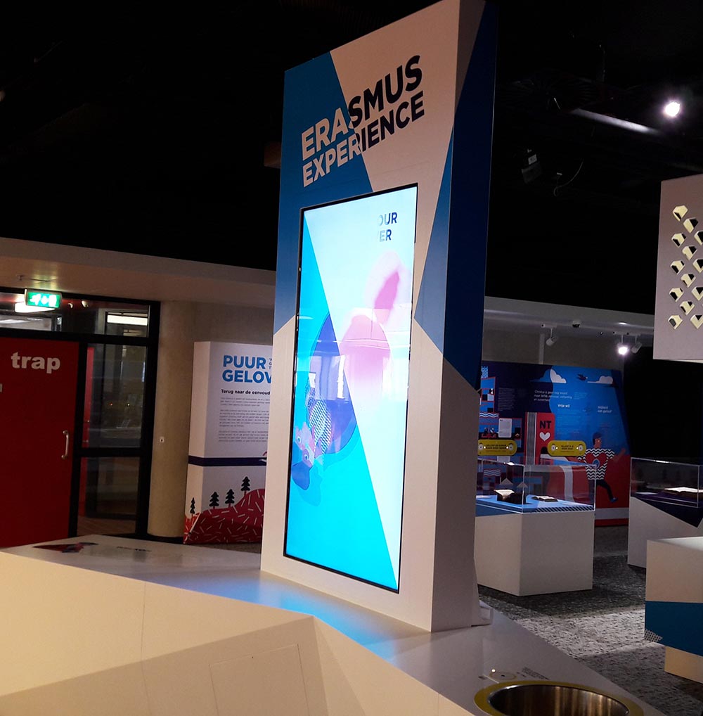De Erasmus Experience is een permanente tentoonstelling in de bibliotheek van Rotterdam en is een fraai gezicht geworden mede door onze print en plak specialisten.