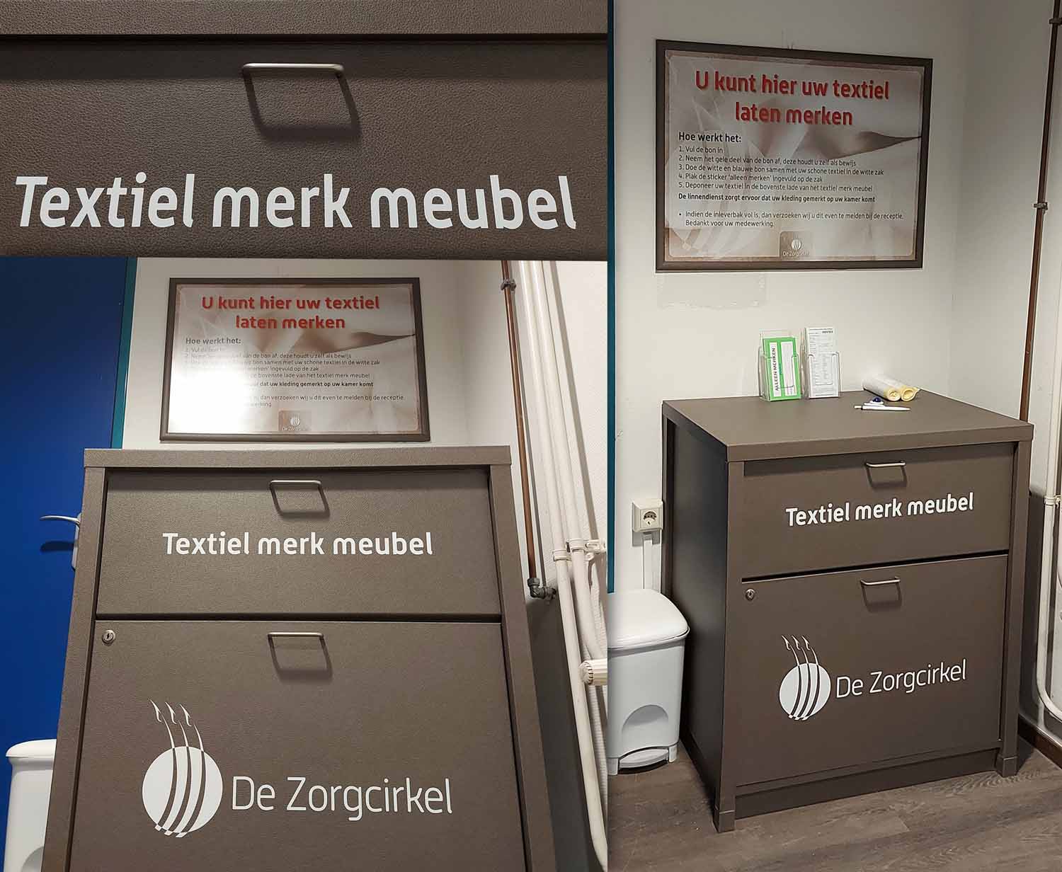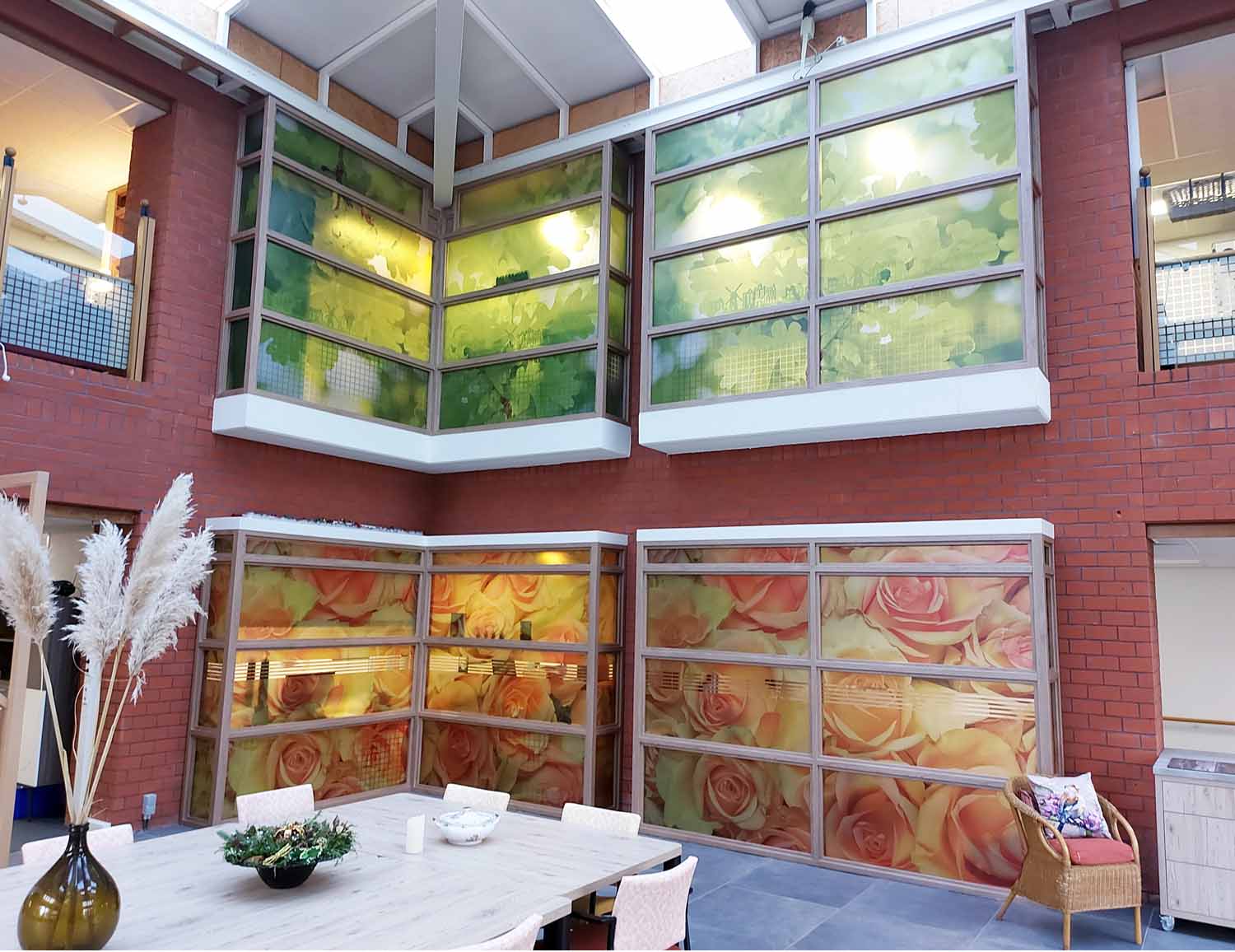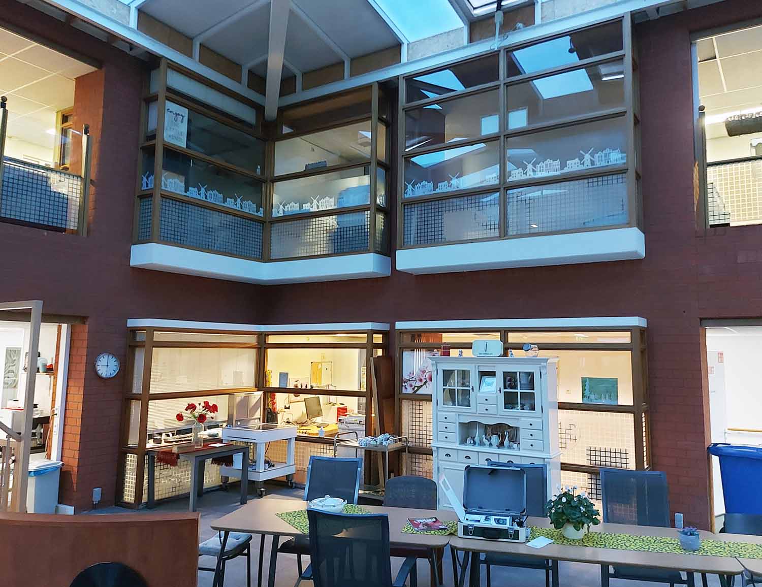 Voor Zorgcirkel De Molentocht droegen wij bij aan de vernieuwing van het interieur. Op de diverse binnenplaatsen zijn de liftombouwen en kozijnen voorzien van nieuwe stijlkleuren met hoogwaardige interieurfolie. Op de ramen brachten we semi-transparante folies met geprinte beelden aan die de namen van de ruimtes aangeven — subtiel, warm en ondersteunend voor oriëntatie.