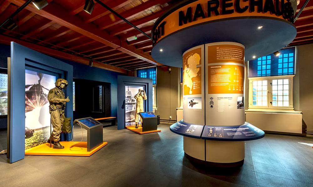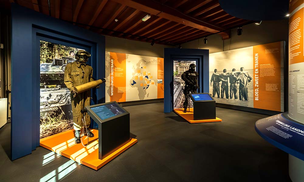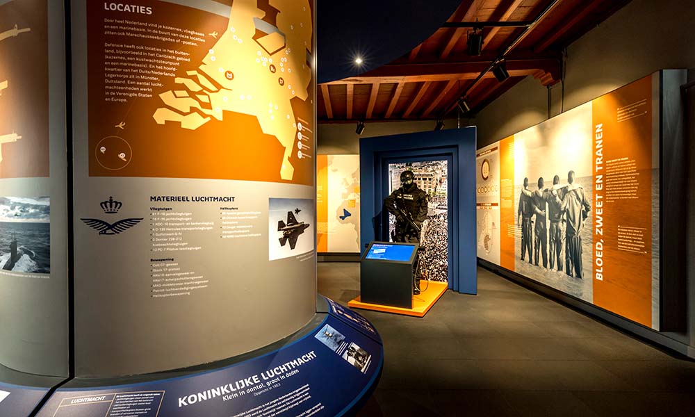 Hier ontdek je alles over de vier krijgsmachtonderdelen Landmacht, Luchtmacht, Marine en Marechaussee. Hoe ze te werk gaan, welke middelen ze gebruiken en hoe ze samenwerken. Wij verzorgden de visuele communicatie met grootformaat wand en meubel prints, gerealiseerd in diverse materialen en technieken.