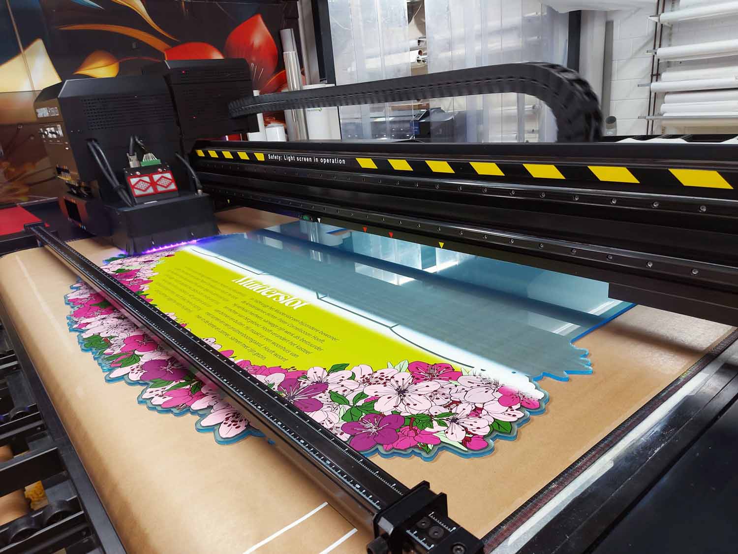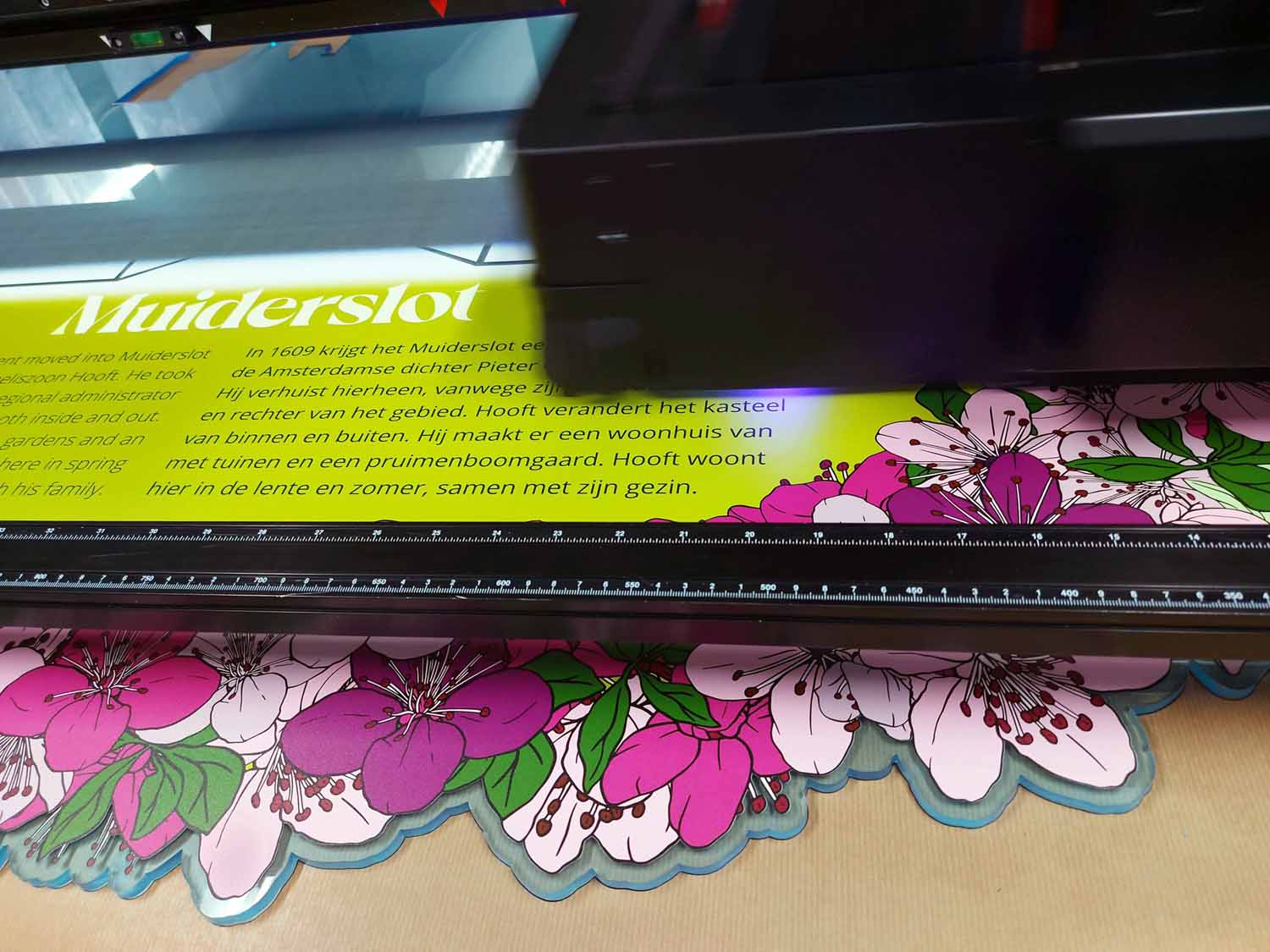 - De titel werd uitgevoerd in gefreesd multiplex, contourgefreesd, geschilderd en voorzien van UV-print — als elegant accent in de ruimte.