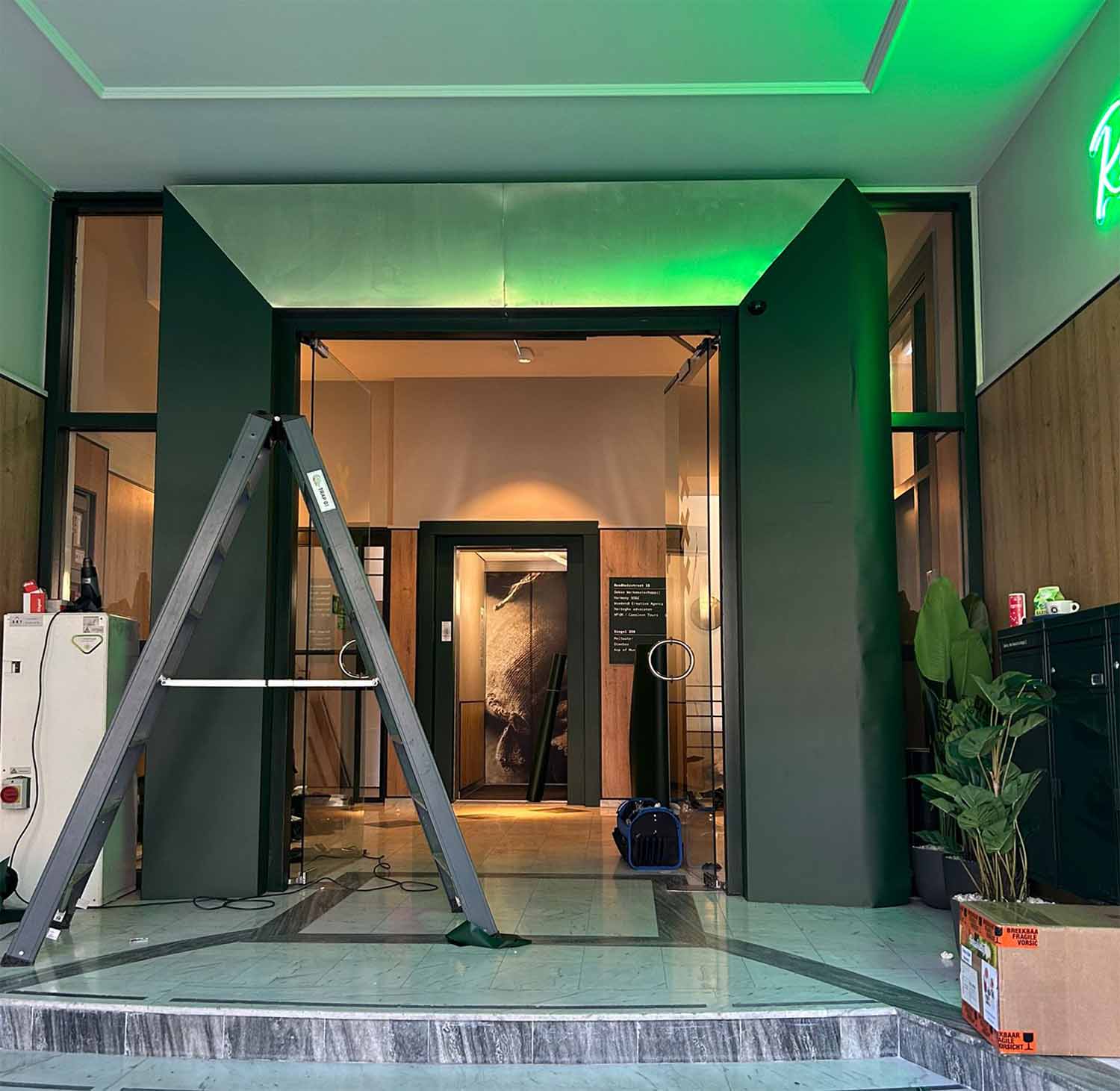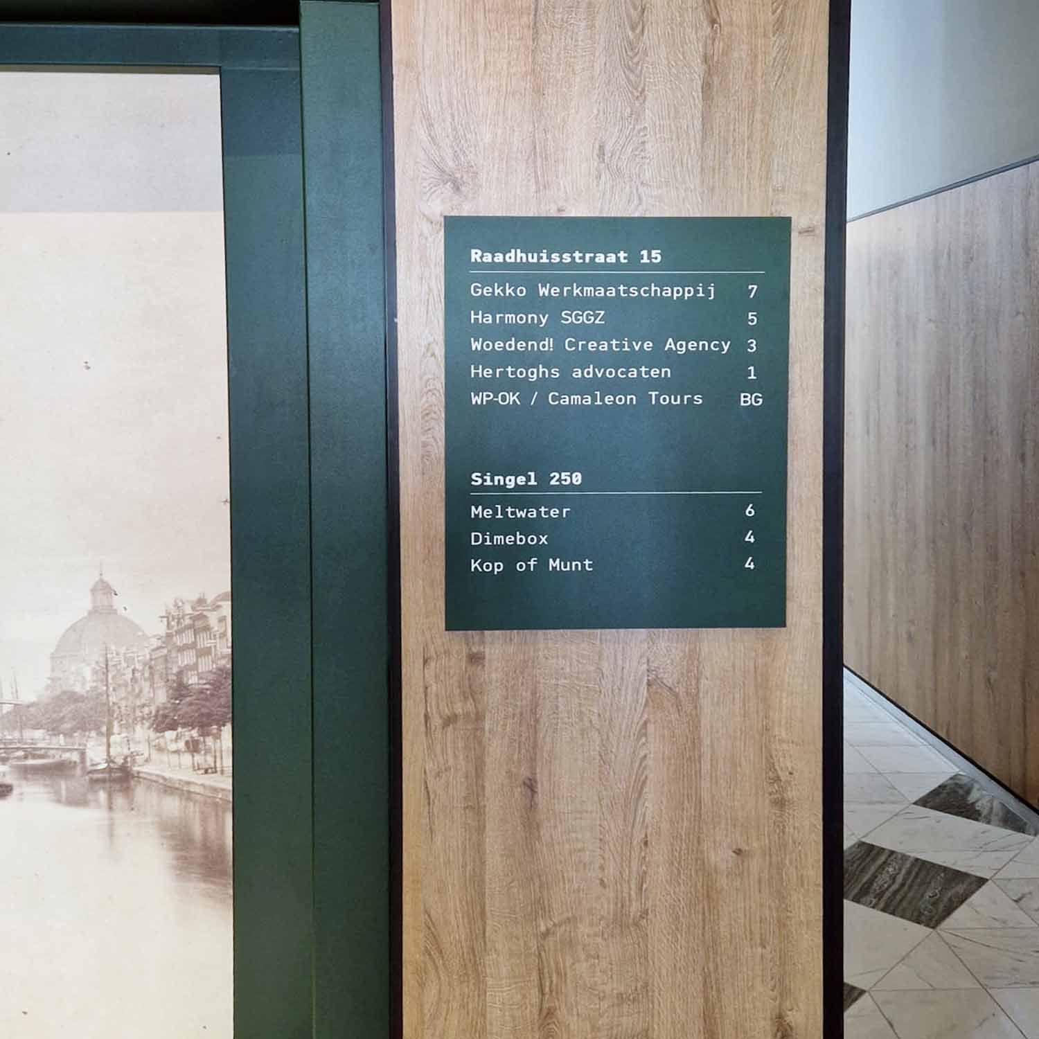 Voor Reijntjes realiseerden wij de complete restyling van de lobby aan de Raadhuisstraat 15. De deurombouw, kozijnen en liften zijn volledig gewrapt met interieurfolies, de naam is uitgevoerd in neonletters en we verzorgden de bewegwijzering en liftborden.